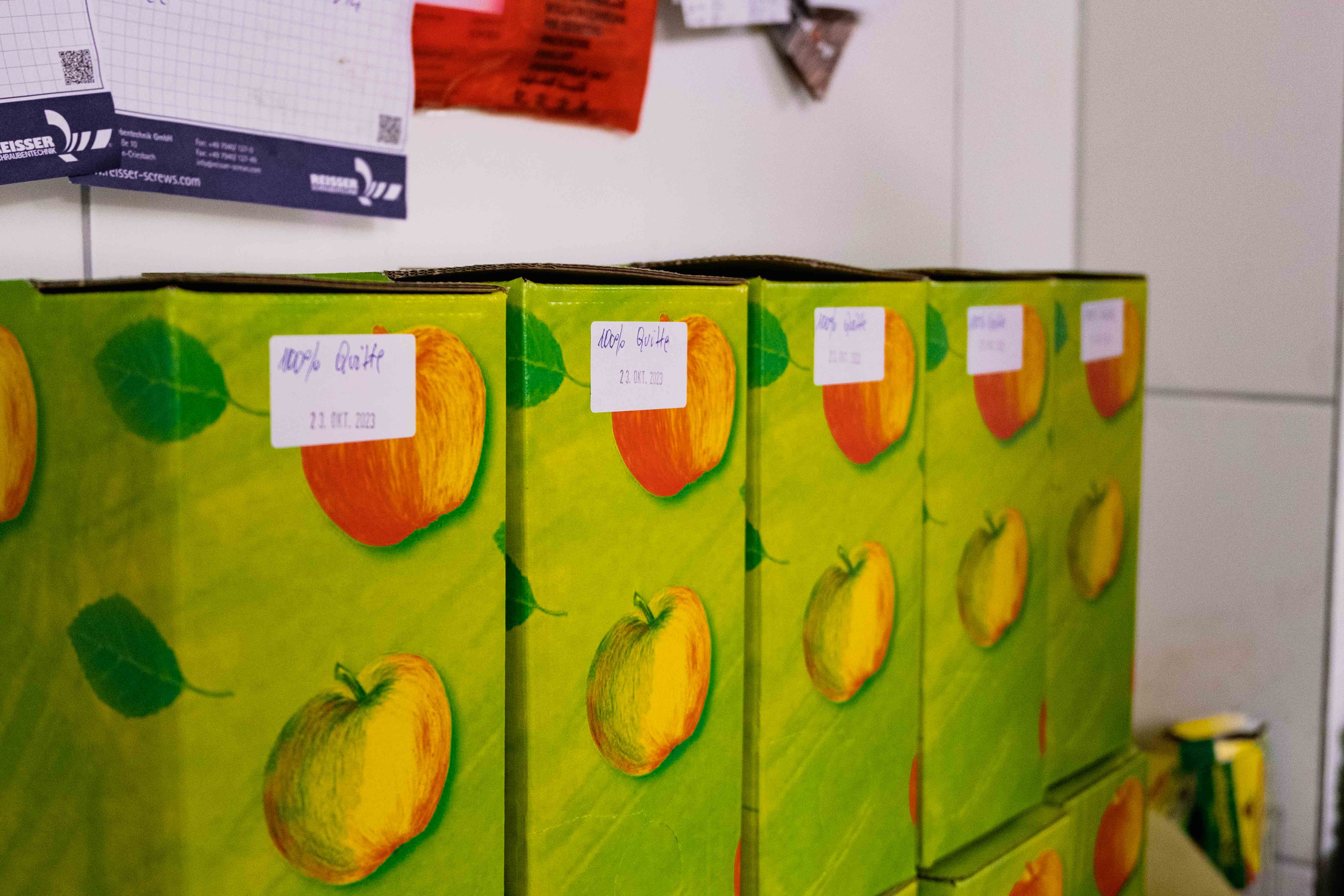 Sie bringen ihr eigenes Obst, welches in einem relativ guten Zustand sein sollte (kein Fallobst) um die bestmögliche Qualität zu erhalten, zu uns. In der Warenannahme verteilen wir ihre Früchte auf personenbezogene Kisten. Anschließend wird das Obst gründlich gewaschen, gehäckselt und die entstandene Maische in Presstücher gepackt. Schließlich pressen wir es in einer sogenannten Packpresse. Der gewonnene Saft wird gefiltert und in einem Pasteurisiergerät auf 78° Grad erhitzt. Nun wird er mit Hilfe einer geeichten Waage in Bag in Boxen abgefüllt.